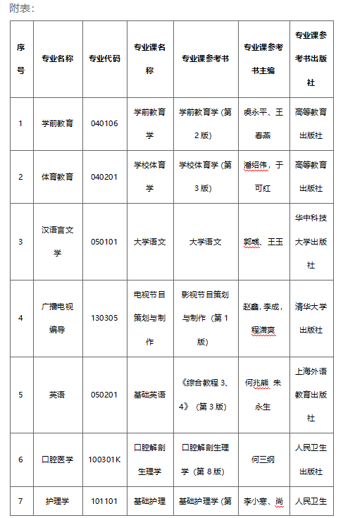各专业考试科目除湖北省统考科目外,还需要进行专业课科目考试,具体科目及参考书籍信息参见附表。退役大员工士兵考试科目按照湖北省教育厅相关工作安排实施,详细内容请参见英国威廉希尔公司官网2025年普通专升本招生简章。